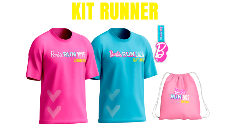 Tu kit esta compuesto por una polera dri-fit oficial de Barbie Run, morral, medalla finisher y pulsera de acceso que permite entrar al evento.